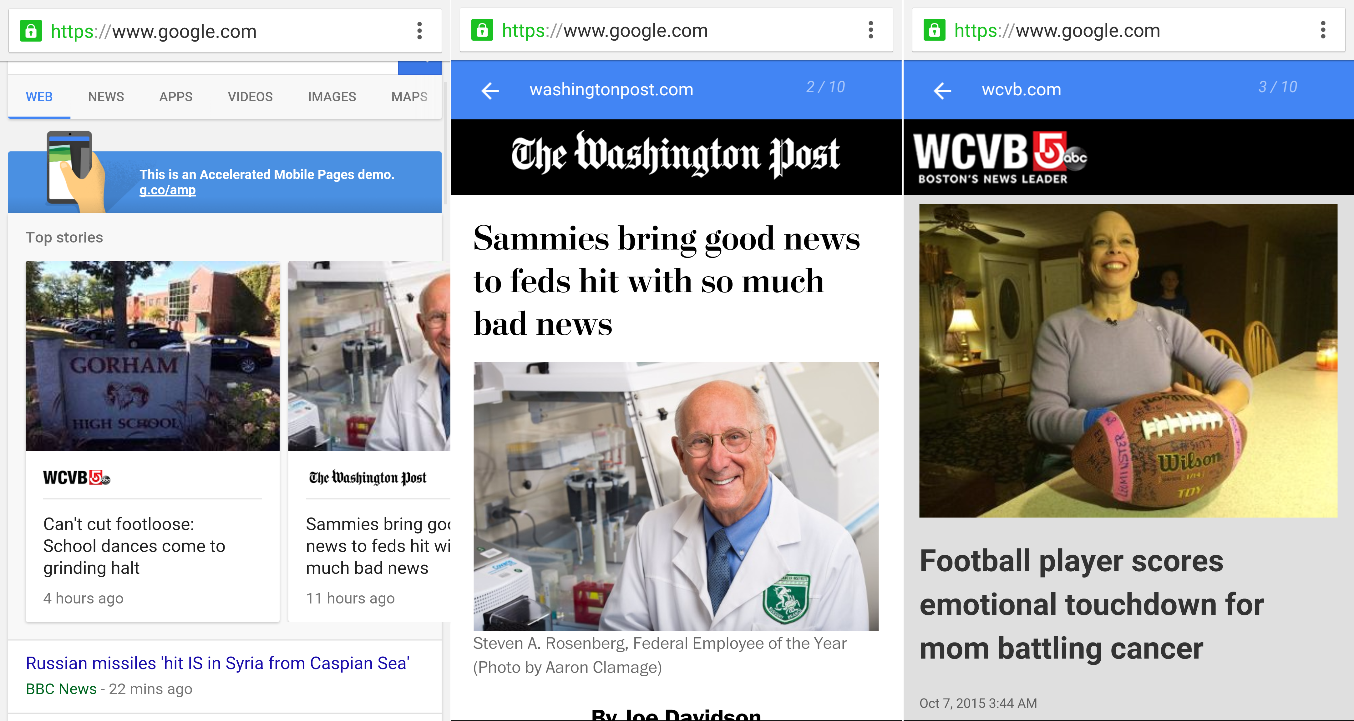 It’s really a great idea — and you can try it out for yourself right now. Nearly 30 publishers from around the world are taking part in the project as of today, and you can even give it a test run by searching for certain queries from Google on your mobile device. Try clicking through to one of these topics, and you’ll find a scrolling carosel of articles that appear in the AMP format at the top of your search: