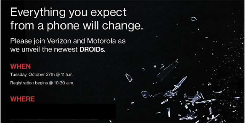 Verizon and Motorola have begun sending out press invites this afternoon for an event to be held on October 27th in New York City. “Everything you expect from a phone will change,” the invite boldly claims. And clearly, the companies are planning to introduce more than one smartphone, as the invite asks members of the press to join as they unveil the newest “DROIDs”…