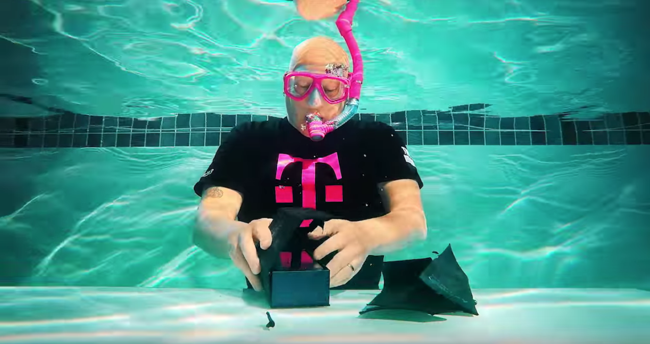 In the video you’ll be watching Sr. Product Manager at T-Mobile Des Smith rip open the phone’s packaging, and it’s pretty much everything you would expect from a video of a guy opening a box in a pool. The pieces of the box and its contents gracefully float away in the pool as he makes his way in, and eventually he pulls the phone out and turns it on all without ever leaving the water.