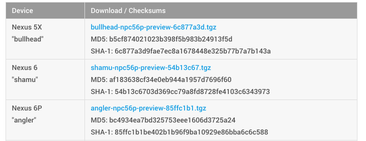 If you haven’t already, grab the latest build of Android N from Google’s factory image page. Once you’ve downloaded the .tgz file, extract it. Inside the extracted .tgz file there will be a .zip file titled something like “volantis-npc56p-preview-0e8ec8ef.zip” (Nexus 9), and after you extract that file, you’ll find the boot loader, OS image, vendor image, and a radio image (depending on your device).