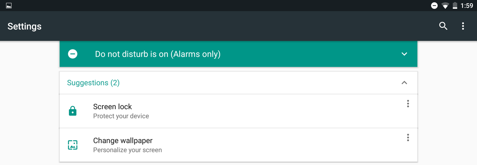 Upon first opening the app you’ll see a new “Suggestions” section at the top of the app. This is used to remind you to do things like set a password for your lock screen or change your wallpaper to customize your device. You can tap a 3-dot drop down to hide these suggestions, and you can hide the suggestions section as a whole as well. You’ll also notice that the top of the app lets you know about settings you might want to disable (in this case, the app tells me that Do not disturb is on, and gives me a quick option to disable it).