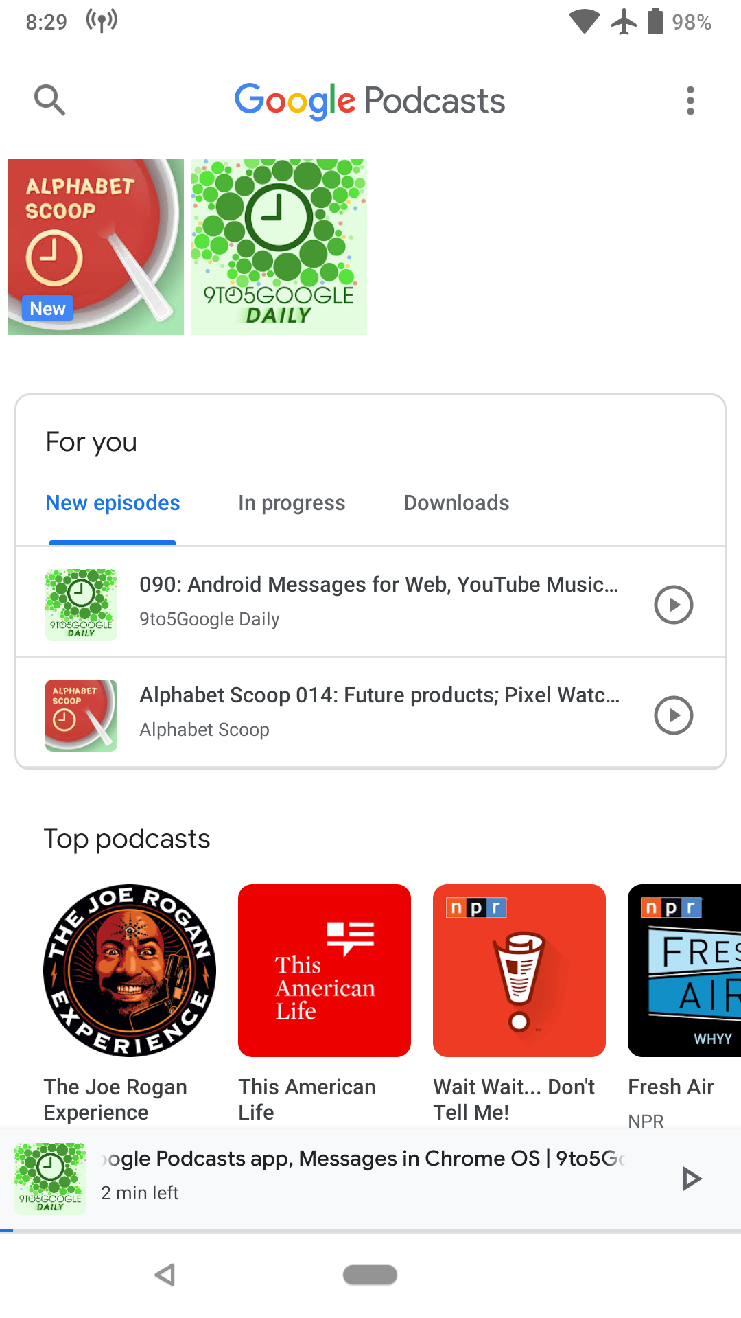 A “For you” section comprised of New episodes, In progress, and Downloads lists is directly below, while the rest of the app features carousels of top and trending shows in various categories. The app will also recommend podcasts to you based on subscriptions and listening habits with AI suggestions getting more personalized over time.