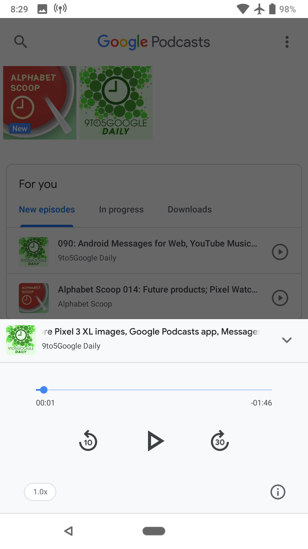 An audio player is always accessible at the bottom of the app with basic controls to adjust playback speed, rewind/forward, and see show notes. The latter interface was just added last week and gives a dedicated page for each episode. From the listing, users are also able to pin artwork right to the homescreen for fast access. Other features include playback sync across devices and integration with Assistant and Google Home.