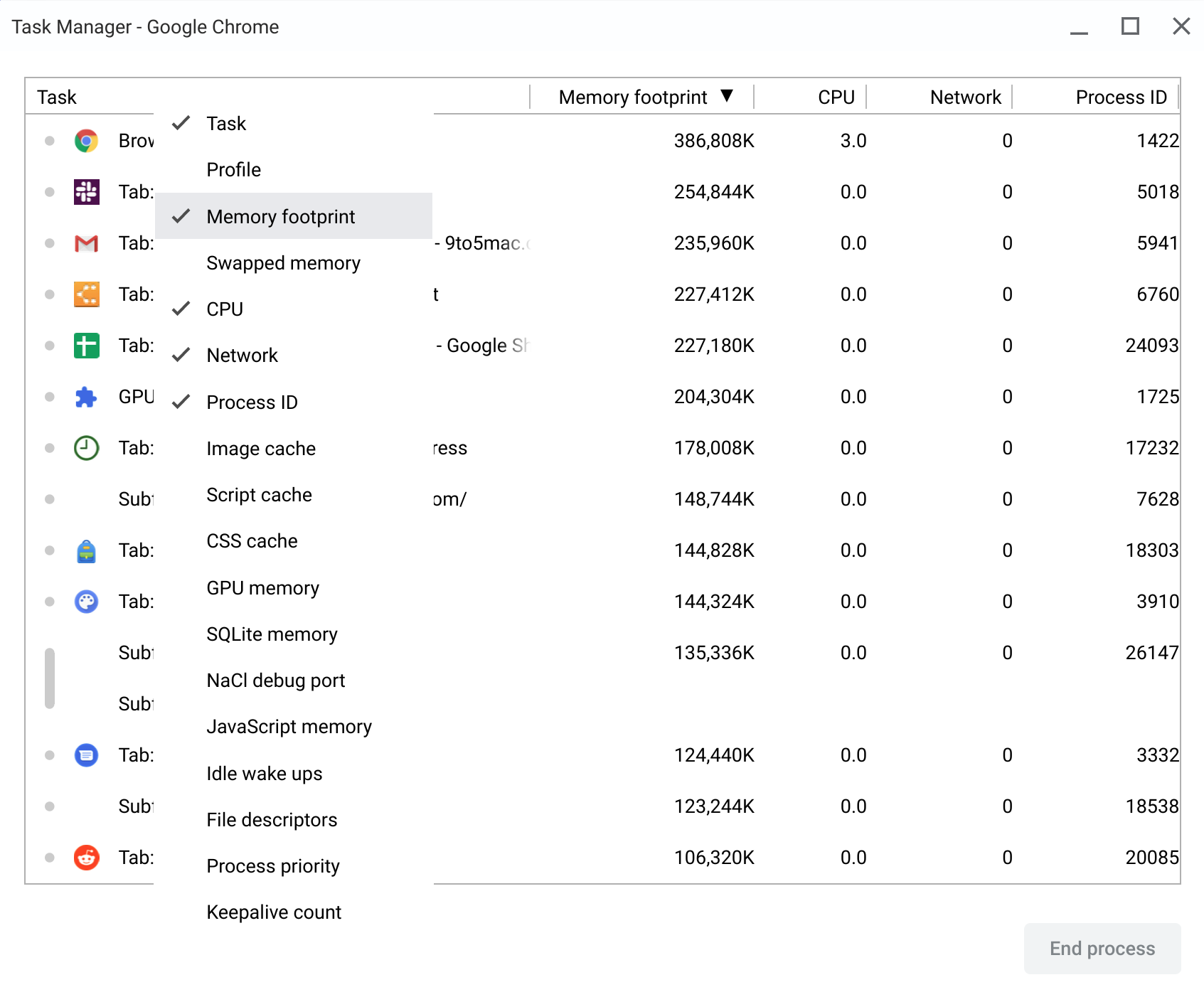 If you’ve already updated to Chrome OS 72 and find yourself in need of the Task Manager, you can also disable the “Memory footprint” column by right-clicking a column header in Task Manager and un-checking “Memory footprint” as seen below. This stops the Task Manager from asking Android for the latest RAM usage info.