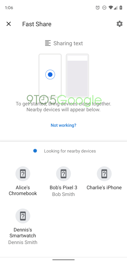 Once you select a recipient from a grid of “nearby devices,” a fullscreen UI will note what is being shared and display a circular progress indicator. Google’s examples interestingly include Chromebooks, other Android devices, smartwatches, and even iPhones.