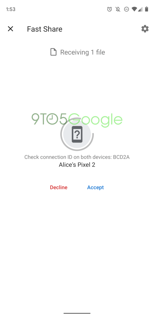 When receiving a file on Android via Fast Share, you will get a notification to “Accept” or “Decline” with details like “Device name” and “connection ID.” There is also a fullscreen interface with the same controls. You can open the file right away once the transfer is complete.
