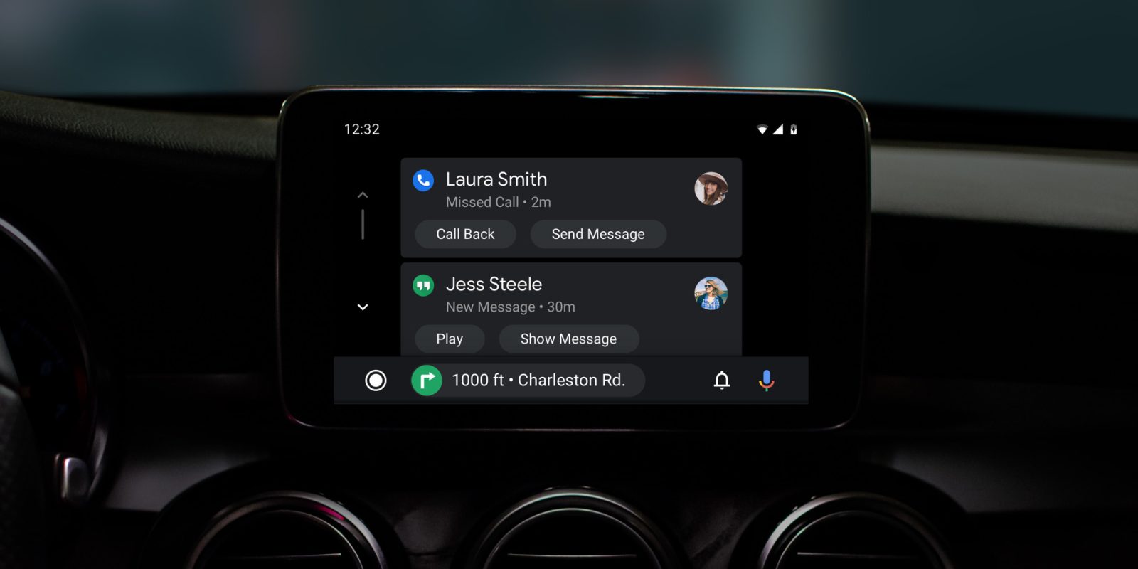 Rounding out the nav bar is an Assistant microphone for voice commands and a bell icon. The latter opens a notification center that lists past calls and messages. Meanwhile, big alerts pop-up from the top with buttons to take immediate action.