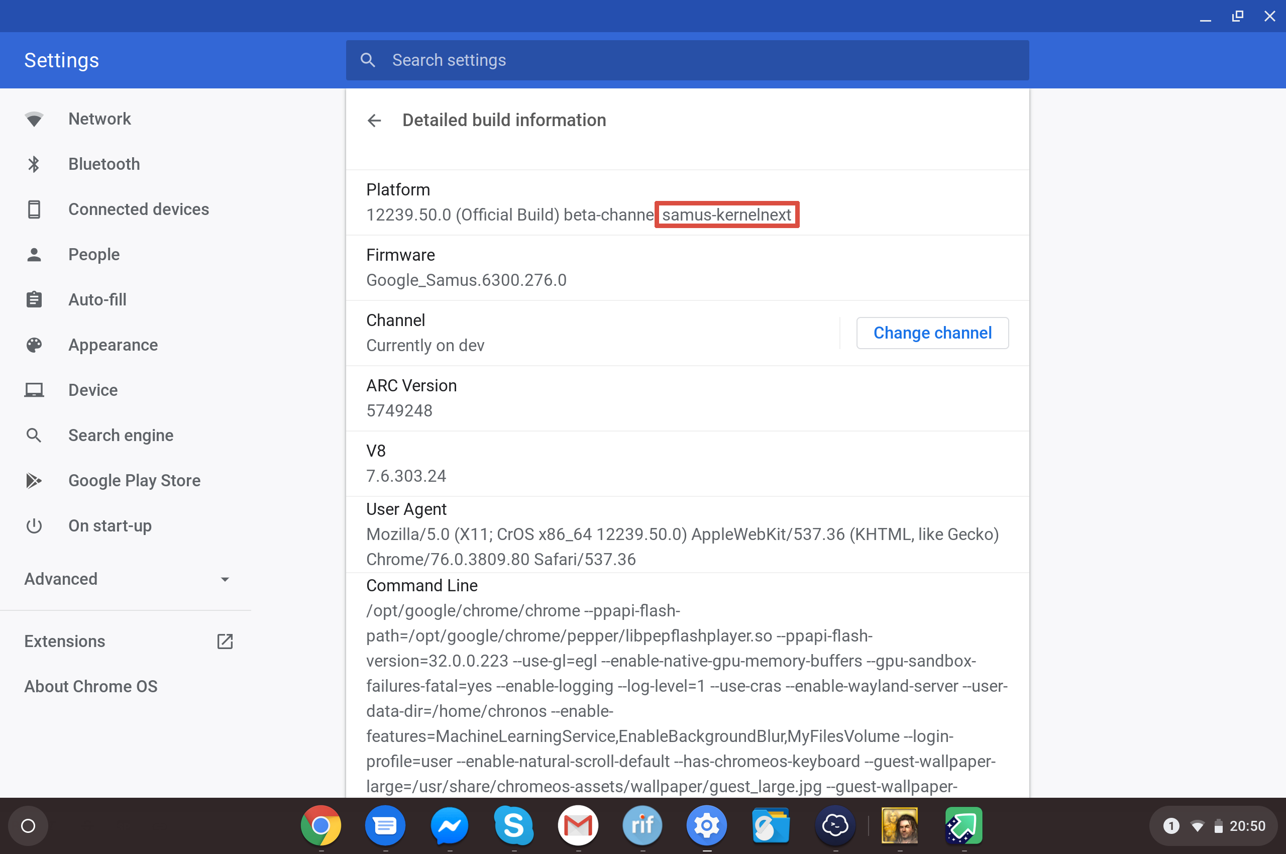 While there isn’t yet a way to manually enable “kernelnext” on your device, there is a simple way to check whether you have it or not. Open the Settings app, click About Chrome OS, then click Detailed build information. On this page, you should see your device’s codename, possibly followed by the word “kernelnext.”