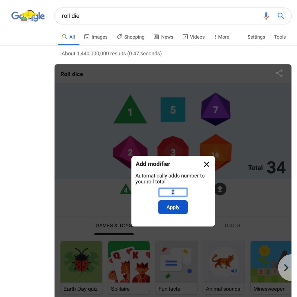 The previous “roll dice” or “roll a die” panel was just a six-sided cube. This tool now also features die with four, eight, ten, twelve, and twenty sides. All six options are listed below with a “modifier” feature for games like Dungeons & Dragons.