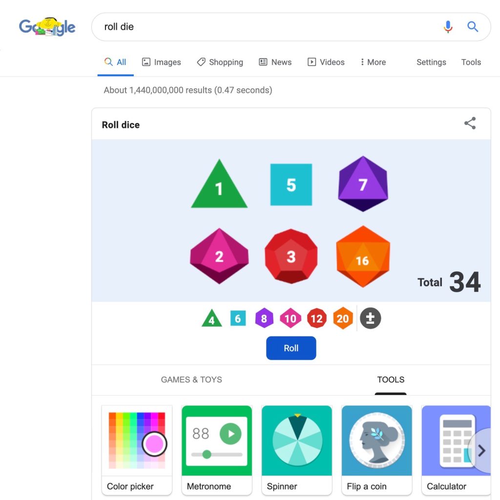 The previous “roll dice” or “roll a die” panel was just a six-sided cube. This tool now also features die with four, eight, ten, twelve, and twenty sides. All six options are listed below with a “modifier” feature for games like Dungeons & Dragons.
