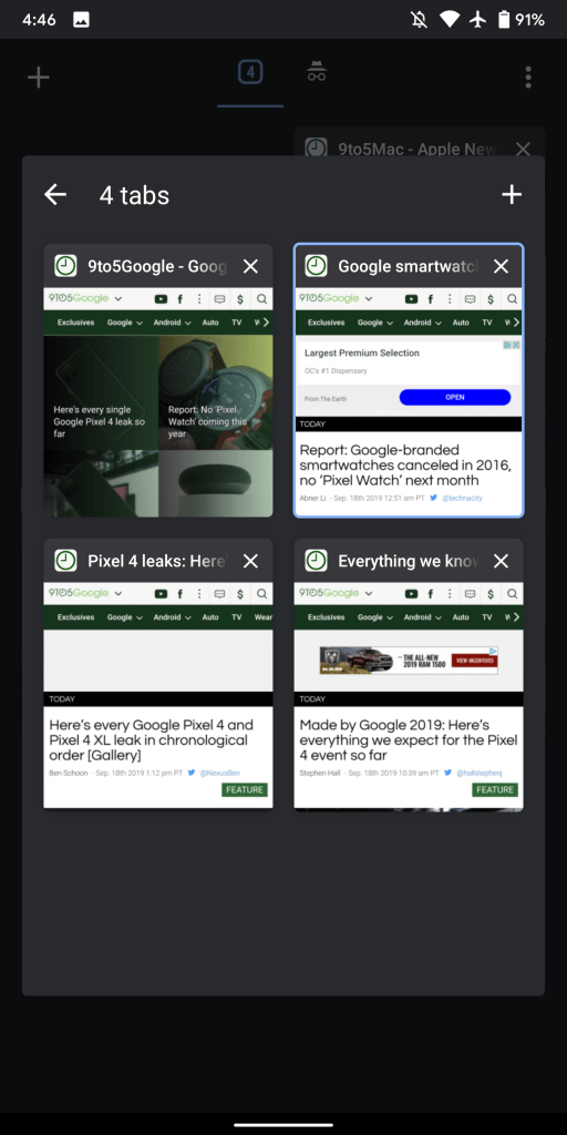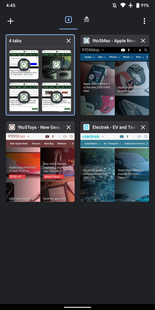 This fall, Chrome for Android is switching to a grid layout where open tabs are represented by small rectangular cards. The top-right corner of each features a close button, but a swipe will perform the same action. As a result of this layout, Incognito pages are no longer shown next to the list of regular tabs. Instead, there’s a simple switcher up top to access another grid view.