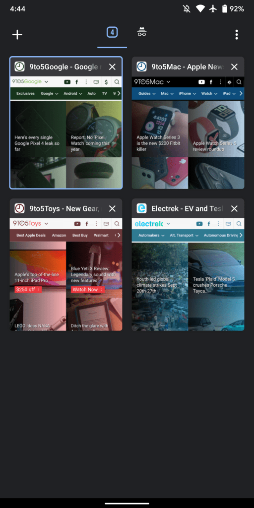 This fall, Chrome for Android is switching to a grid layout where open tabs are represented by small rectangular cards. The top-right corner of each features a close button, but a swipe will perform the same action. As a result of this layout, Incognito pages are no longer shown next to the list of regular tabs. Instead, there’s a simple switcher up top to access another grid view.