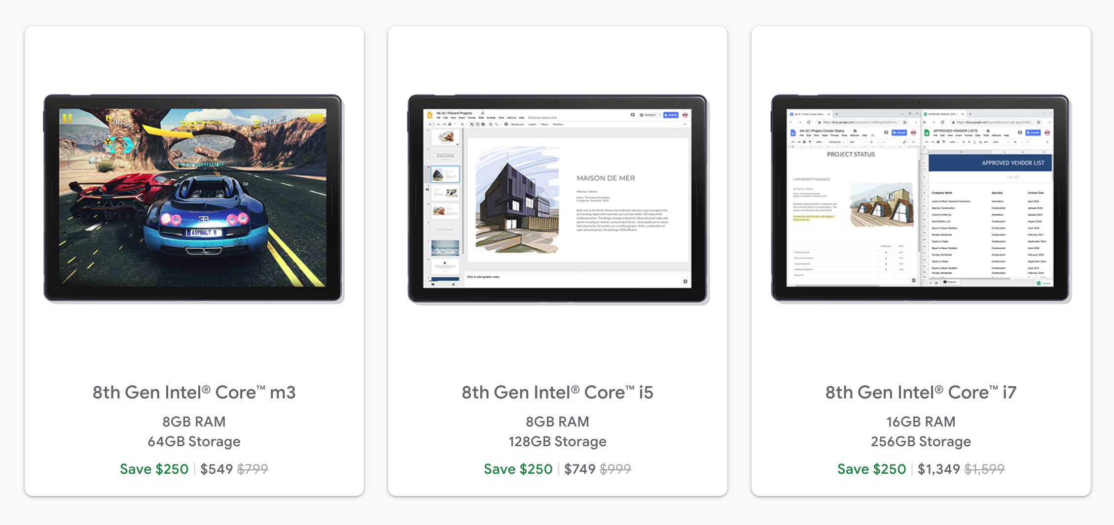 The biggest question mark on the Google Pixelbook Go right now is pricing. Evidence points to the Pixelbook Go offering a base model with specs near identical to the Pixel Slate’s current base model (not the Celeron models), with an Intel Core m3 processor and 8 GB of RAM. This model of Pixel Slate originally sold for $999, was later dropped to $799, and at of time of writing is on sale at $549 plus a free keyboard.