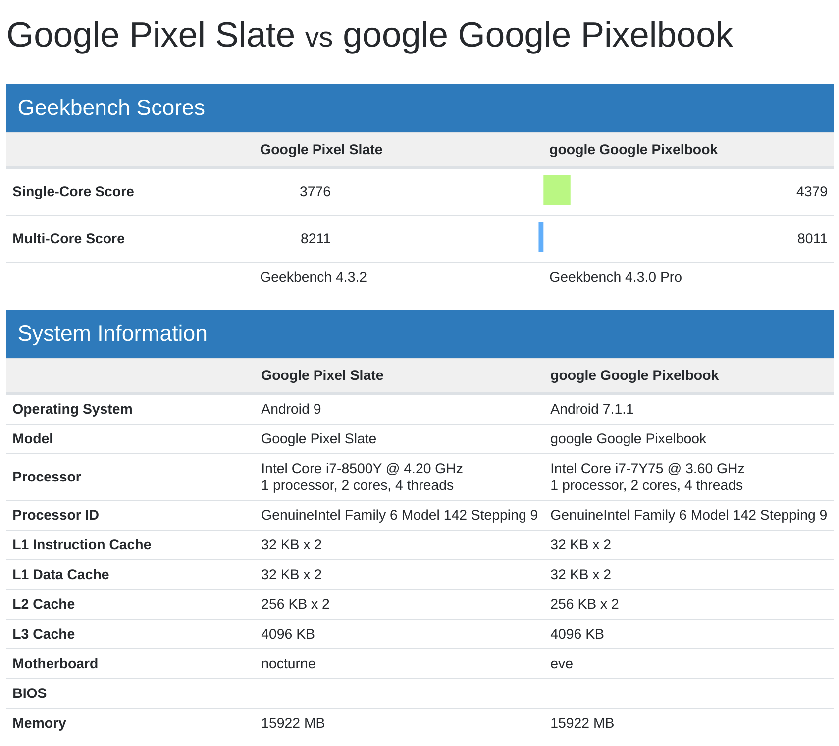 Releasing two years apart, the Pixelbook Go will offer 8th Generation Intel Core processors, an upgrade to the 7th Generation ones used in the original Pixelbook. However, the Pixelbook Go will use the exact same processors found in the various models of Pixel Slate, excluding the Celeron. This means we can use the Pixel Slate’s performance as a rough estimate to see if the Pixelbook Go may offer a performance upgrade over the original Pixelbook.