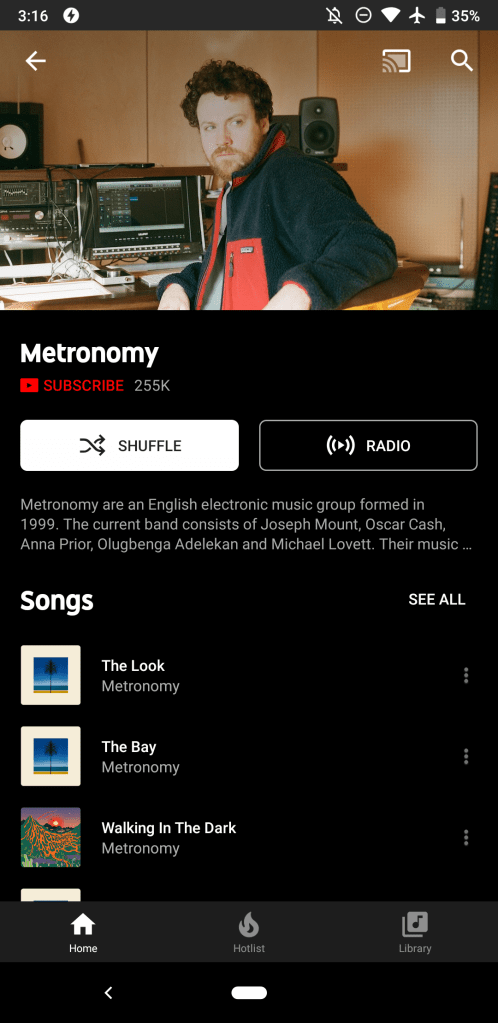 This YouTube Music artist redesign starts with a larger cover image that has a closer crop. As the photo begins to fade, the musician name prominently appears, while the “Subscribe” button with follower count is now centered.