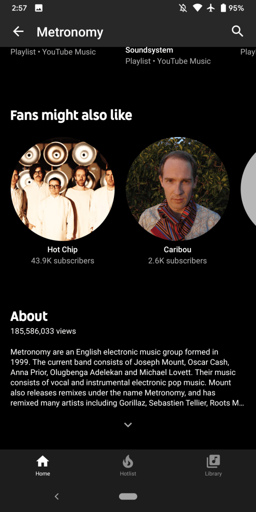 The very bottom of the YouTube Music artist redesign is home to the “About” section that was previous above. You can tap the chevron to expand, while a total view count is now included.