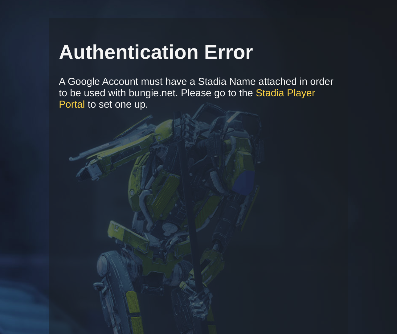 Following through with the prompt, you’re (sadly) brought to an error screen featuring Destiny’s Sweeper Bot indicating that your “Google Account must have a Stadia Name attached in order to be used with bungie.net.” Interestingly, this new page also suggests that you create a Stadia Name through the “Stadia Player Portal” which links to Stadia.com.
