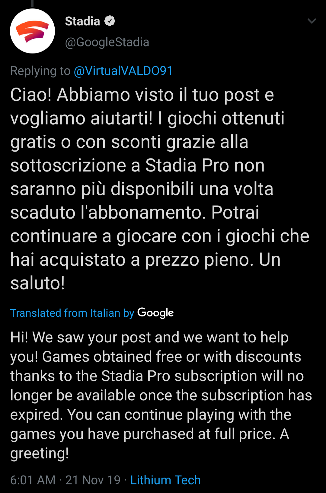 In response to an Italian Google Stadia customer’s question about Stadia Pro’s exclusive discounts, the official Stadia account tweeted to the effect that games purchased with the Stadia Pro discount would be lost when unsubscribing.