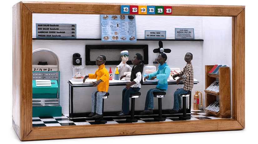 Leading in Black History Month, Google is honoring the anniversary of the Greensboro Sit-in with a striking diorama of the event, designed by guest artist Karen Collins. Collins is the creator of the African American Miniature Museum, a mobile showcase of other thought-provoking scenes of African American activist movements past and present.