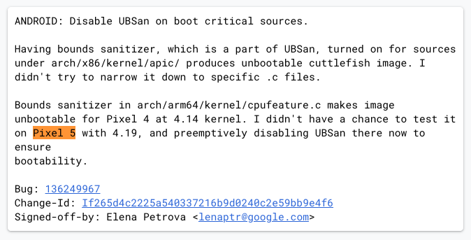 The code itself is of little interest to us, as it deals with disabling an optimization to C code called UndefinedBehaviorSanitizer (UBSan). Instead, take note of the version numbers listed, “Pixel 4 at 4.14” and “Pixel 5 with 4.19.” These are the version numbers for the underlying Linux kernel that Android uses on these devices, usually as provided by Qualcomm.