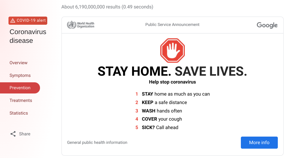 The most important of the coronavirus tips Google shows is, again, to please stay home. For those times when you need to leave in order to get groceries, be sure to maintain a safe distance from others, with six feet or more being ideal.