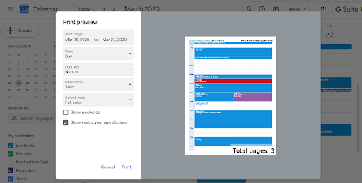 Google has also made changes for users that print out their calendars. A new full-color option lets you “keep track of different event types more easily” by being able to distinguish entries, while “View” lets users print one day (full 24 hours) or week per sheet.