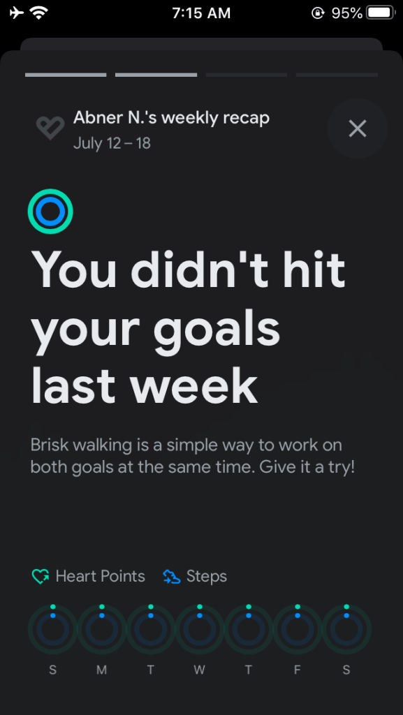 Information is presented as a story with navigation through the four pages performed by tapping or swiping. The first thing covered is whether or not you hit your Heart Point and step goals. An activity suggestion is provided on how you can fulfill next time, while daily rings are presented at the bottom.