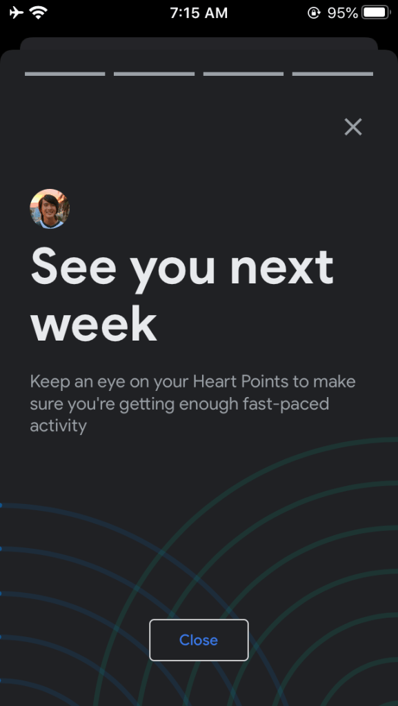 The next card is focused on the Heart Points metric with a historical recap of recent weeks. It joins a progress card for Heart Points that appeared with the April redesign when you’re close to accomplishing the goal. The recap ends on a metric to keep an eye on, while the screen can also be closed by swiping down.
