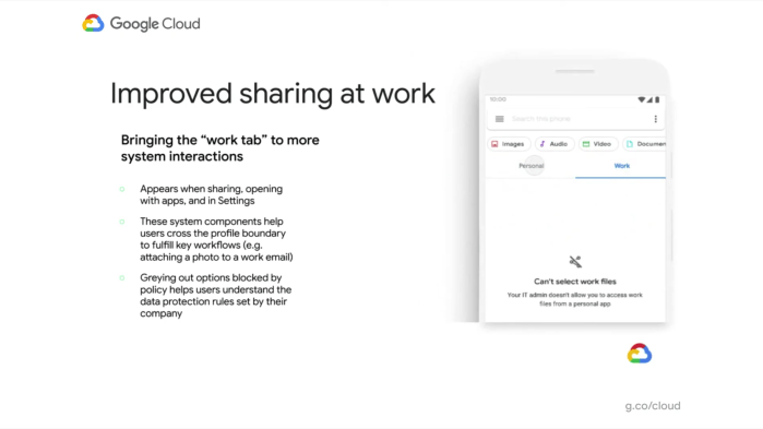 In bringing the “Work” tab to more parts of the OS, Google said at Cloud Next that it wants to “make the separation between work and personal data clearer to end-users.”
