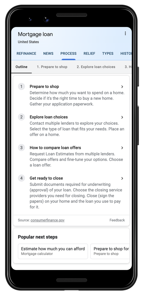 Working with the Consumer Financial Protection Bureau (CFPB), looking up “mortgage” on a mobile device “breaks down the complex mortgage process into easy-to-follow steps to help guide you, wherever you may be in the process.”