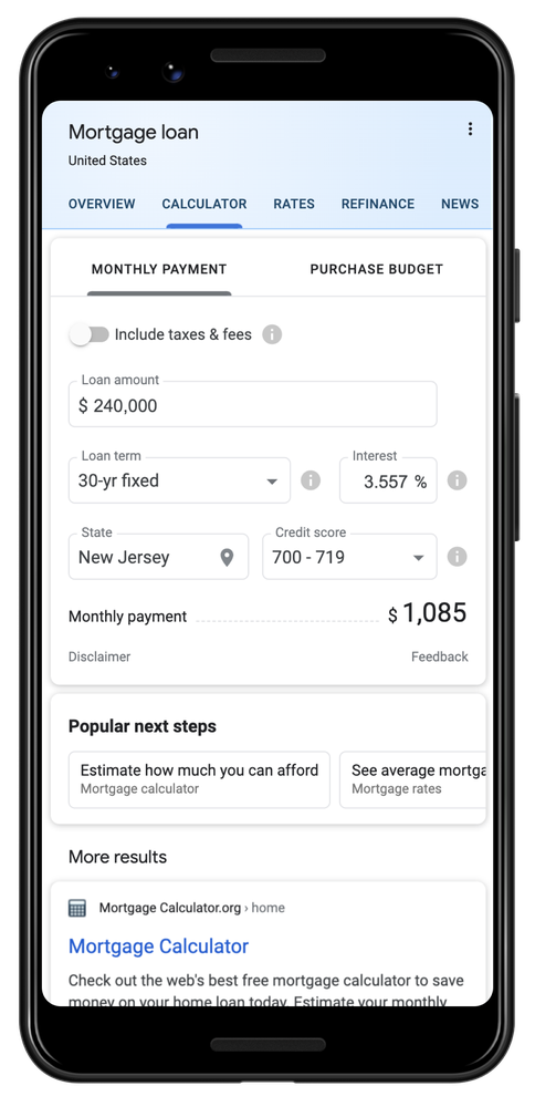 In recent years, Google has worked to directly surface answers to popular questions as the first result. Google Search now has a Knowledge Panel to explain the US mortgage process and provide useful tools.