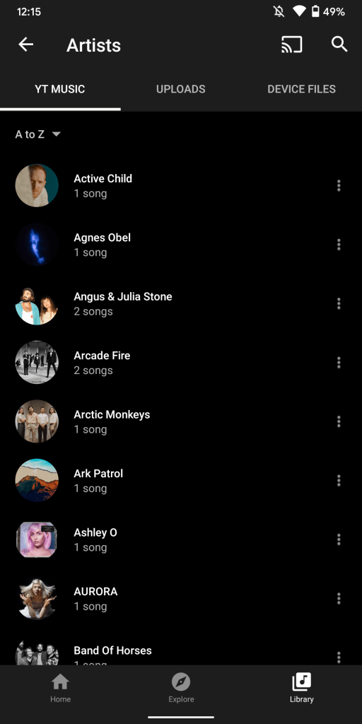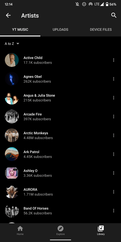 The Library tab lets you see content by Downloads, Playlists, Albums, Songs, Artists, and Subscriptions. That second-to-last section still shows a list of singers and bands. However, the artist name is now accompanied by a count of your songs, instead of YouTube subscribers.