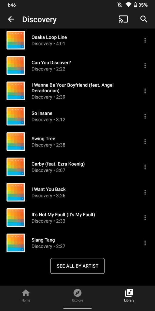 Tapping an artist from this list will show songs that you’ve added to your library. This view previously took you to the full artist page accessible from search and features their entire catalogue. That’s still accessible from a “See all by artist” button at the bottom.