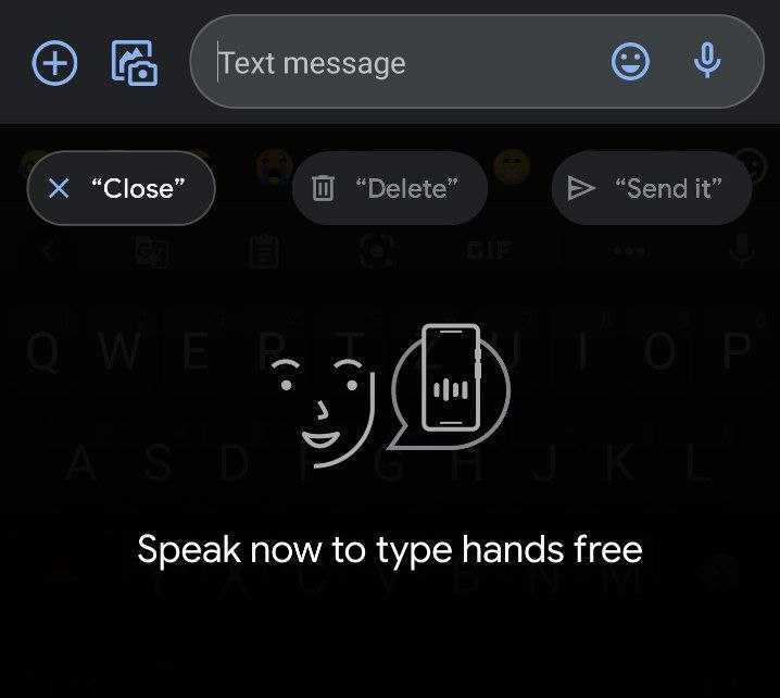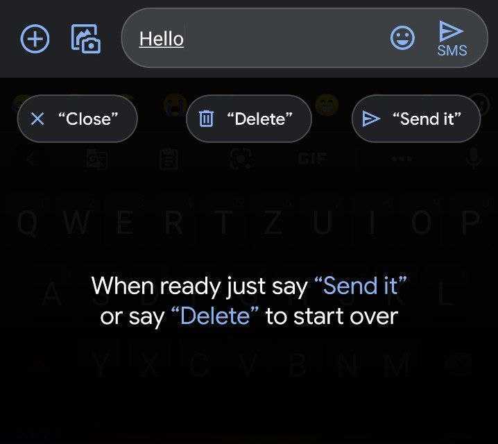 Users are invited to “Speak now to type hands free.” There are three buttons up top that you can tap or just speak — note the quotations: Close, Delete, and Send it.
