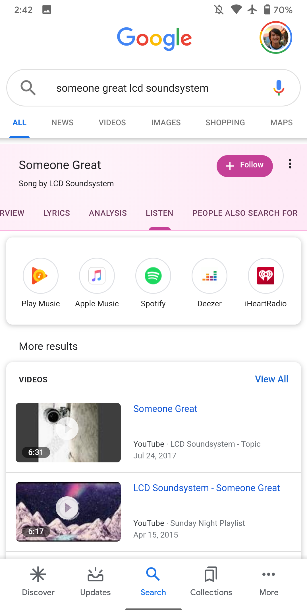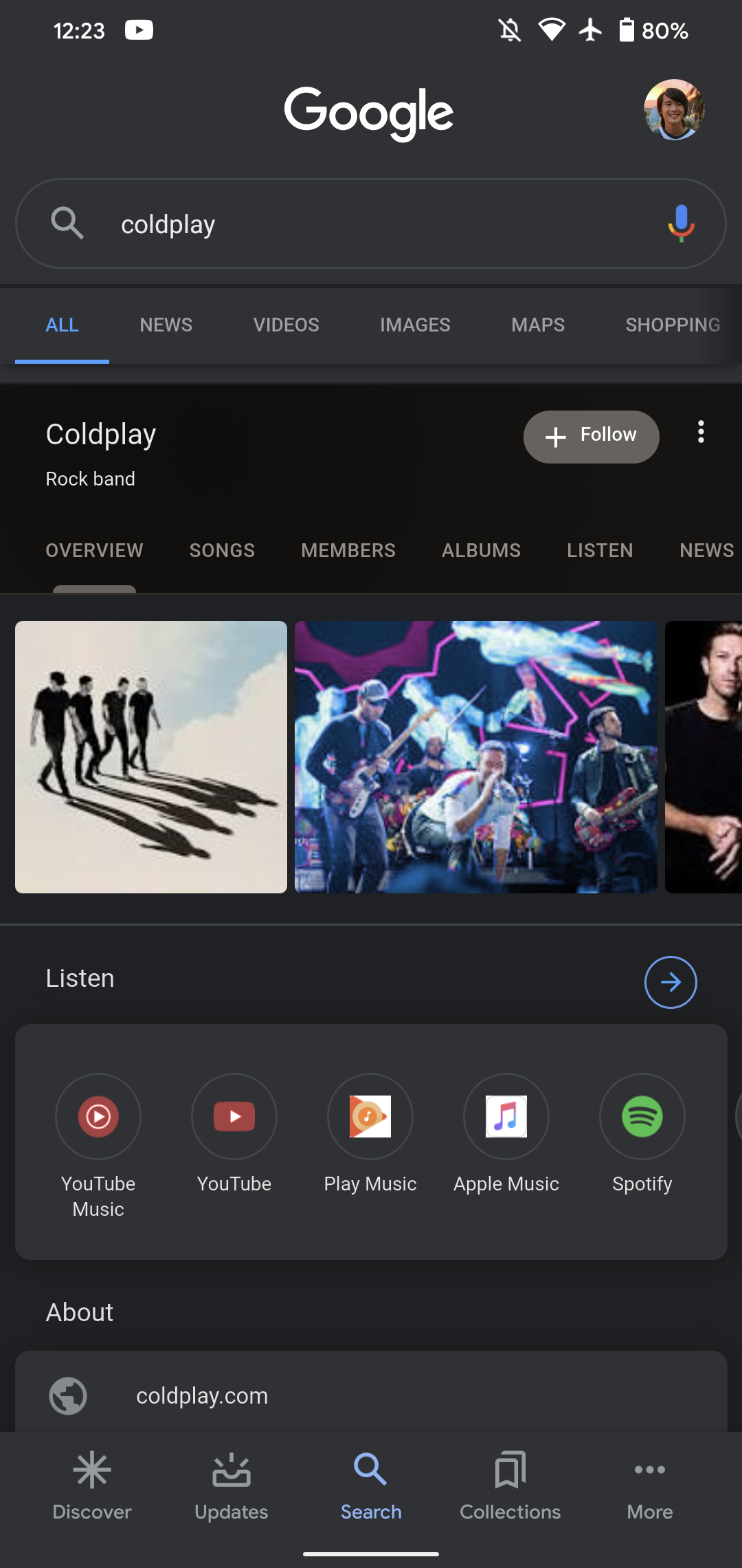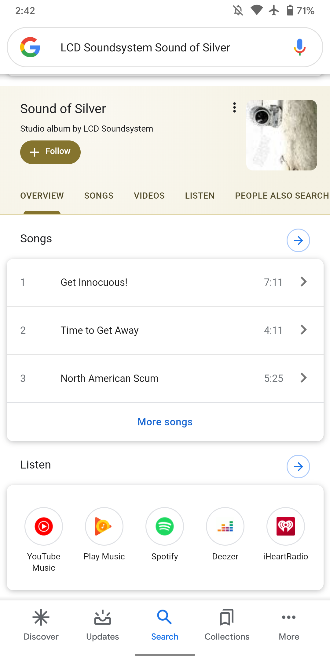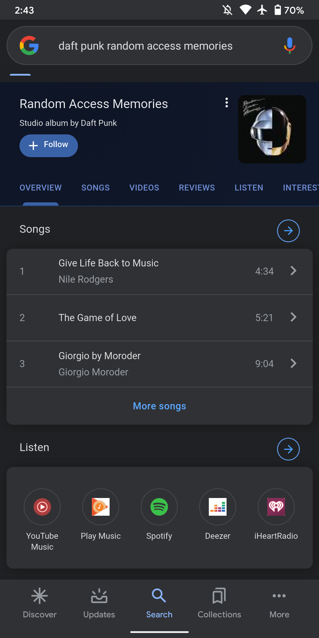 Original 3/6: Like with movies and television shows, looking up music on Google yields useful information like lyrics, track list, and reviews. Search also links to streaming services where you can start listening immediately. On mobile, there’s a tray of icons in the Overview tab, while there’s also a “Listen” tab.