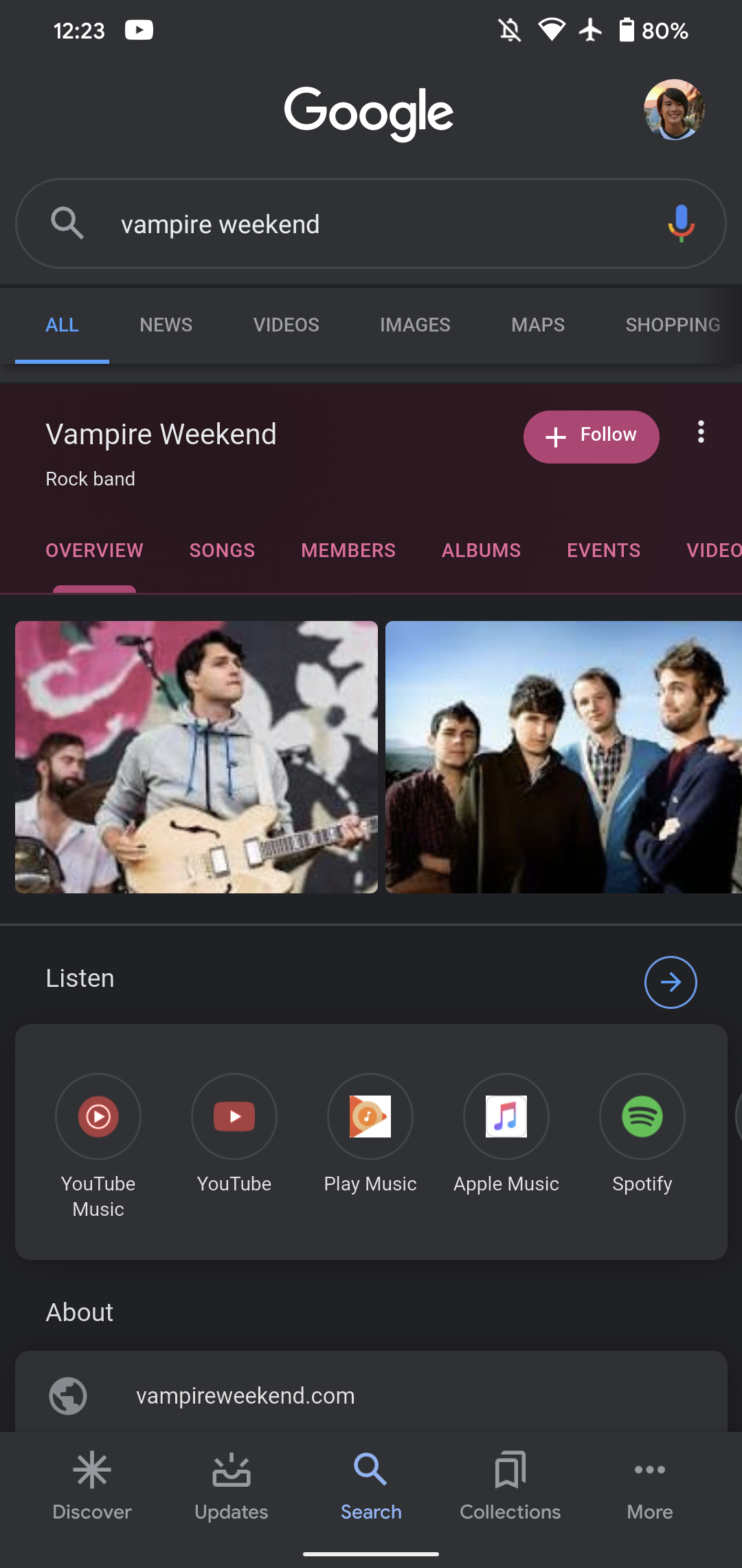 Update 5/3: Google Search now links to YouTube Music when you look for artists. Clicking will open a band’s profile in-app. In the “Listen” card/tab, the streaming service is listed before YouTube, Play Music, and third-party offerings. This integration is still not available for individual tracks.