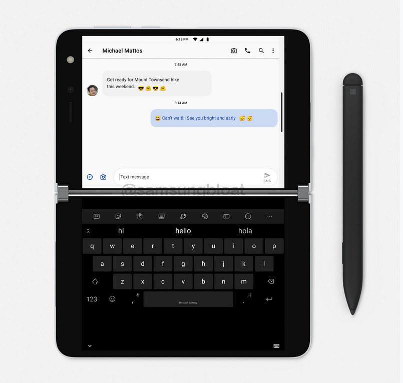 Update 8/11: More press images have leaked showing the box contents (via @samsungbloat). Besides a USB-C to USB-C cable and charger, a white case with bump — presumably for grip — looks to be included in the packaging. We also see shots of the Surface Slim Pen compared to an open Duo. There’s also an image of Surface Buds in a new, non-silver “Glacier” color.