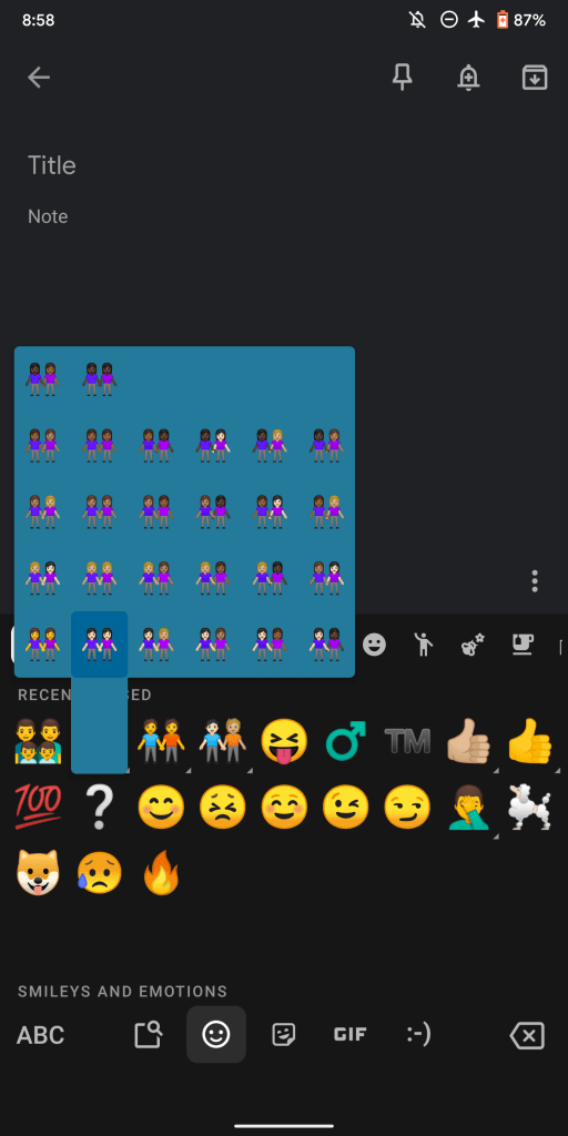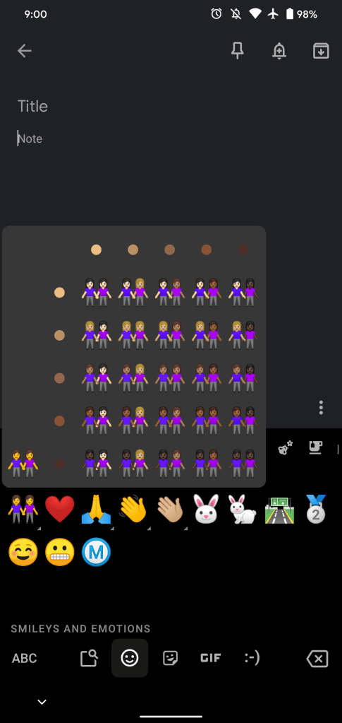 Instead of being arranged in a spectrum, holding down on a Gboard emoji that has variants — as denoted in the corner — shows an ordered table. The first line corresponds to the person at the right, while the first row represents the left-most character in a pairing.