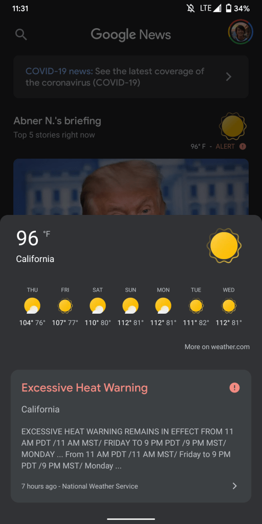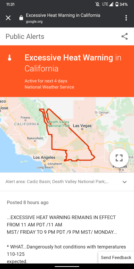 In this case, “Excessive Heat Warning” appears again in red. The time it was issued/updated appears at the bottom with the agency responsible (National Weather Service). The first few lines appear while a click opens Google’s Public Alerts page for the event. This includes a map and the full advisory with the option to open in Chrome.