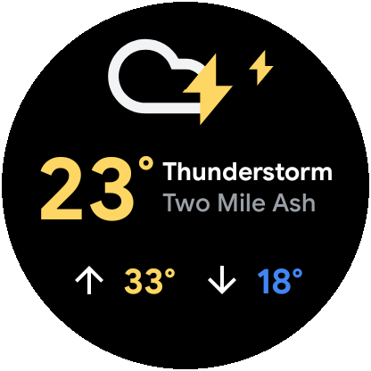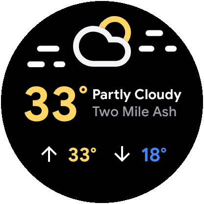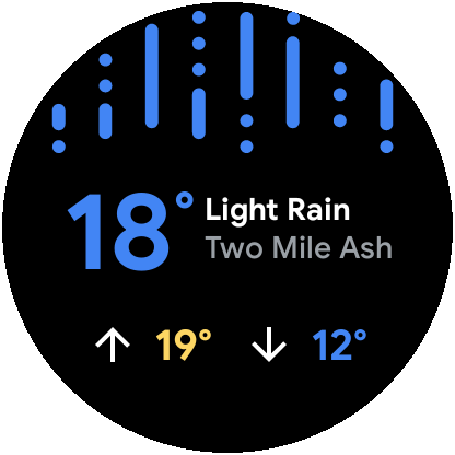 With large iconography and numbers, it will be “easier to read while on the go.” It starts with a large icon for the current condition, while there’s an equally big temperature readout that also notes your current location. High/low temperatures round out the tile, with this serving as an example of Wear OS providing “more helpful experiences.”
