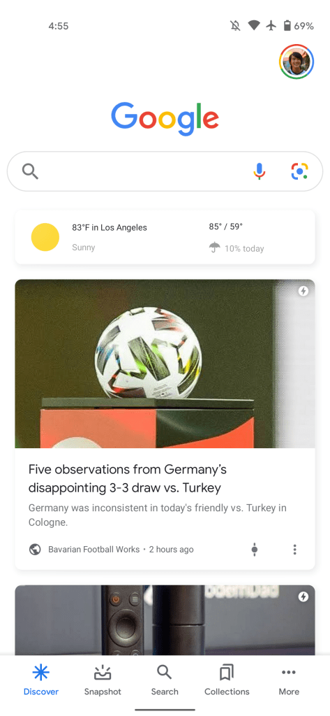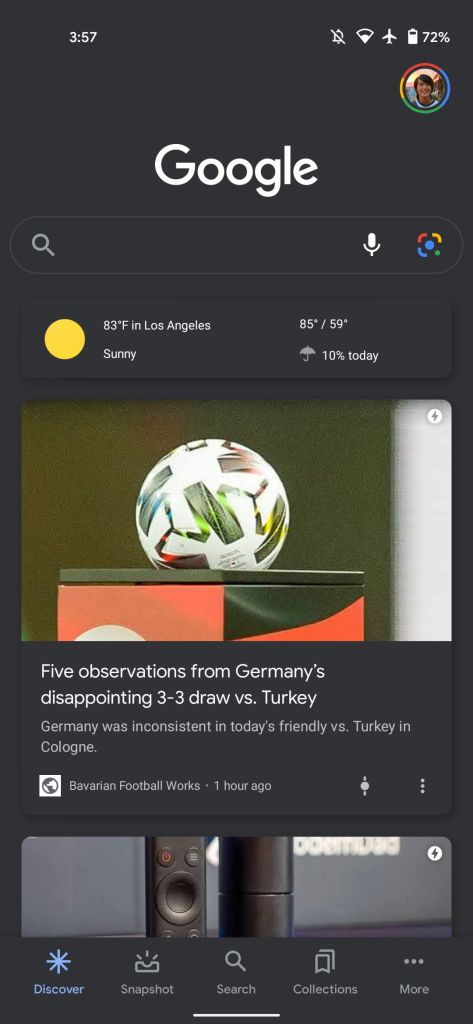 The Google app for Android is now testing an identical shortcut. Some users today running the latest 11.31 beta — which hints at Driving Mode and sleep integration — have a Lens icon at the very right of the pill. The voice search icon has been moved to the left. When using dark mode, that mic is gray, but the Lens camera icon does not get a similar treatment.