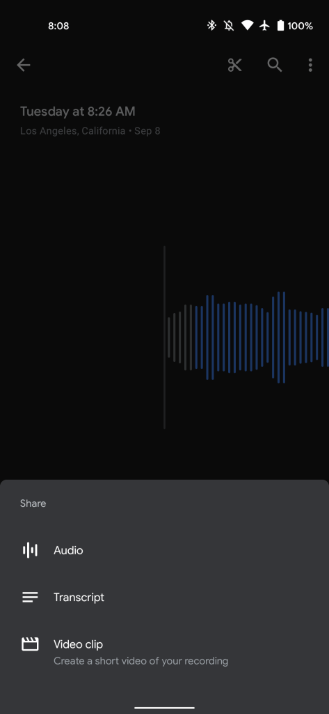 That joint upload option has been removed in 2.0, though there is still the ability to directly save text to Google Docs under “Transcript” in the “Share” menu, which has been visually tweaked to use a sheet rather than a pop-up.