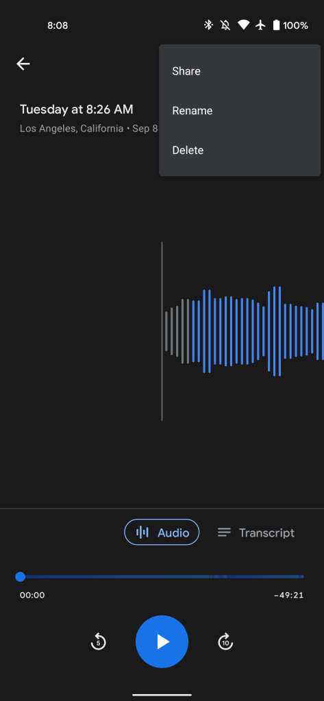 When viewing a recording, the top-right corner of the app now features an “Edit recording” feature in addition to Search and the overflow menu. Under “More options,” 2.0 presents Share, Rename, and Delete.