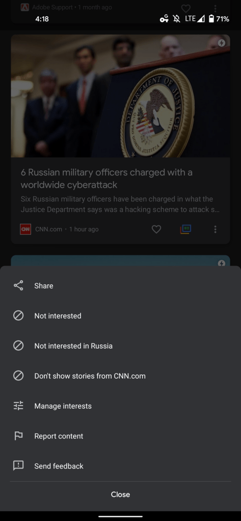 Previously, you could tell Google whether you wanted “more” or “less” of a topic in Discover. Appearing in the bottom-right corner of a card, the company now only lets you quickly leave positive feedback. The opposite sentiment can be left in the overflow menu using “Not interested.” As part of this change, “Hide this story” is removed from the overflow sheet.