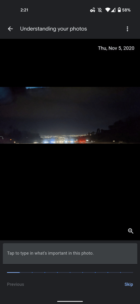 Google wants to better understand “what’s important to you” in pictures. The “Understanding your photos” screen presents pictures from your library with the date noted in the top-right corner. You’re asked to “type in what’s important,” with the option to skip and a progress bar below.