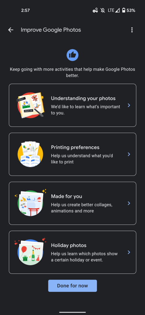 A Google Help document explains how it “may take time to see your contributions impact your account, but your input will help improve existing features and build new ones, like improved suggestions on which photos to print or higher quality creations that you would like.”