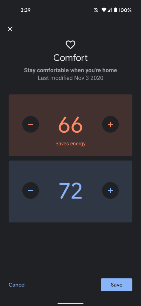 One notable change with this schedule is that there’s no “Eco” mode that can override the schedule anymore. That’s a shame, honestly. In the cool fall months, I was enjoying skipping the schedule on my Nest Thermostat E and using Eco mode to keep the AC/heat turned mostly off, only kicking in if the house was truly too cold or warm. With the Nest Thermostat (2020), the system is either off entirely or using your schedule, there’s no in-between unless you manually change the temperature.