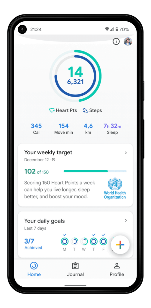 A feed of more health information follows, with this revamp placing each metric in compact cards. Stats like daily goals, Heart Points, steps, and blood pressure are shown over the course of a week. Weight gets a month-to-month view, while your last workout is visualized on a map. This approach means that you’re more likely to pick up information from the Home tab without having to dive into the individual metric.