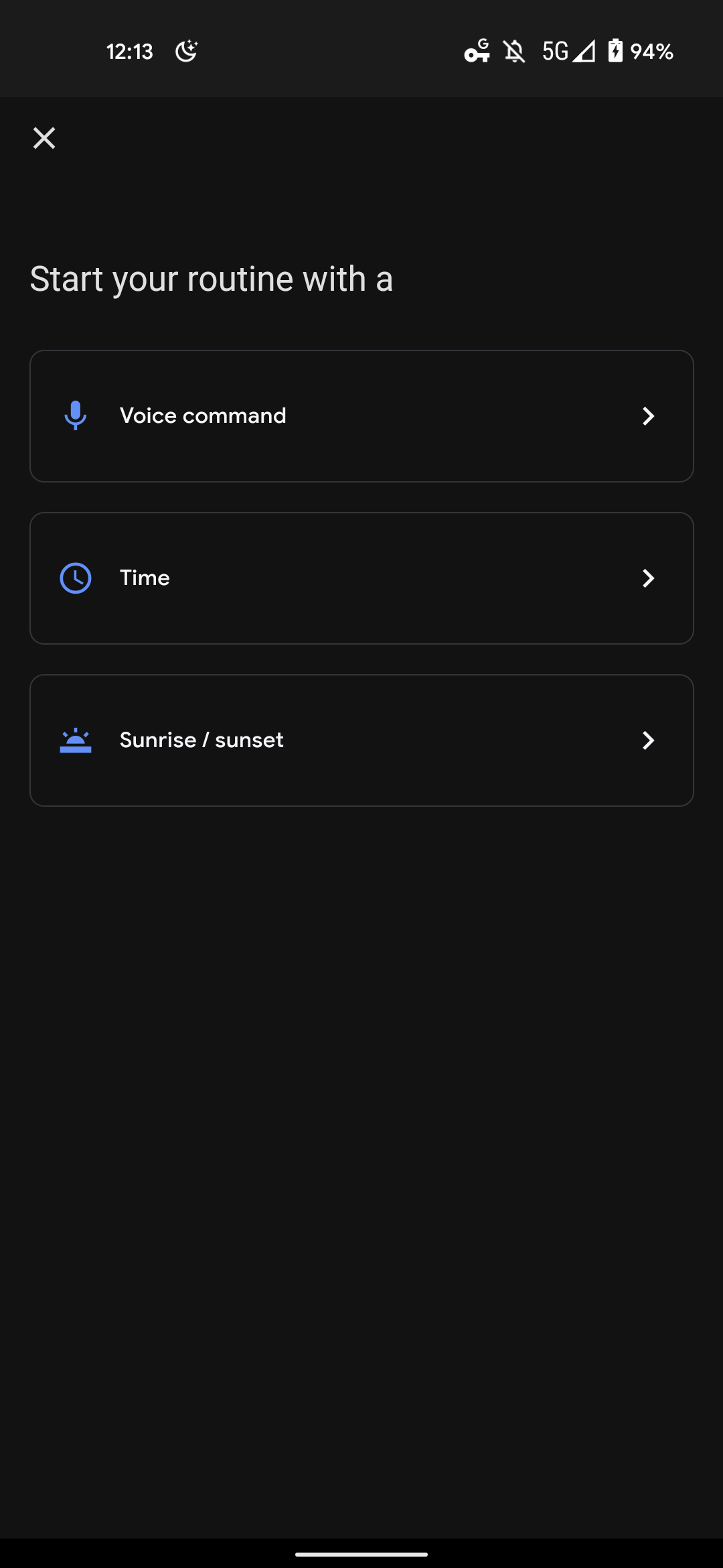When creating a “New routine,” you’ll be greeted with a very simple page separated into two sections. Users first specify “How to start,” with the voice command and time option unchanged from before. However, the latter starter can now be replaced by “Sunrise/sunset.”