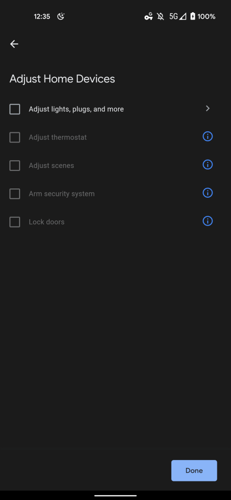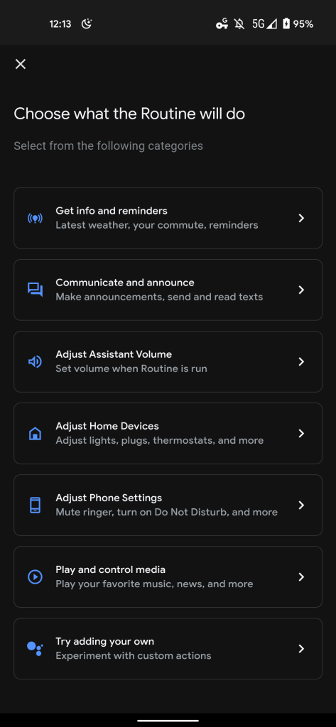 The next step is setting an action. Google has a new “Choose what the Routine will do” page that first provides a high-level list of categories/capabilities. Diving into one offers the same set of commands as before.